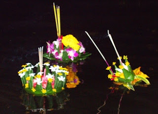 "Krathong sai" the simplest version, is made of sliced trunks of banana tree decorated with candles stringed together, numbering the same as your age or more. Floating away this krathong is equivalent to floating away your bad luck. "Krathong lek" is made of banana leaves decorated with flowers, looking similar to a lotus blossom. Couples often float each of their krathong lek together, a gesture seen by the local folk as very romantic.